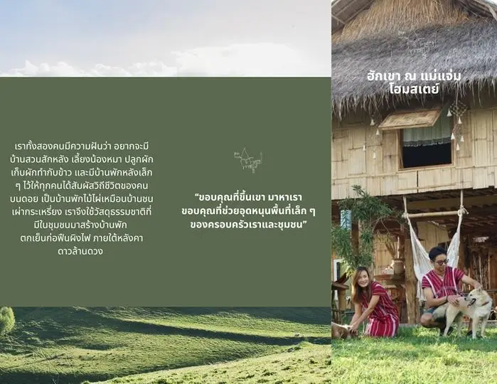 ที่นี่คือโฮมสเตย์เล็กๆ ในอำเภอแม่แจ่มท่ามกลางสวนลำไย ที่มีบ้านพักเพียง 4 หลังเท่านั้น ยังคงวิถีชีวิตที่เรียบง่าย ทำสวน ปลูกผัก เก็บผักทำกับข้าว ใช้วัตถุดิบที่มีในสวน และผักริมรั้วของชาวบ้านในชุมชนมาทำอาหารให้ทุกคนได้ทาน รายได้จากท่านส่วนหนึ่งยังคงหมุนเวียนเข้าสู่ชุมชนเพื่อกระจายรายได้ เป็นค่าจ้าง วัตถุดิบทำอาหาร และวัสดุก่อสร้างจากธรรมชาติ เช่น ไม้ไผ่ ใบคา ใบตองตึง
